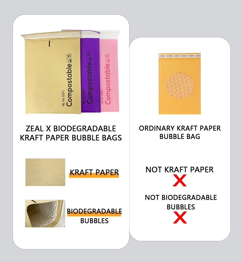 Како професионален производител на хартиени кеси, Zeal X нуди целосно приспособливи испраќачи со меурчиња со меурчиња за крафт хартија што може да се приспособат, вклучувајќи прилагодени големини, печатење лого и опции за тежина на хартијата. Овие поштари за компостирање се 100% биоразградливи, нетоксични и без загадување, што ги прави идеални за стратегии за одржливо пакување. Со силна отпорност на кинење, лесен дизајн и сигурна заштита за брза испорака, на нашите испраќачи со меурчиња за крафт хартија им веруваат глобалните продавачи на е-трговија кои бараат еколошки решенија за испорака без пластика.